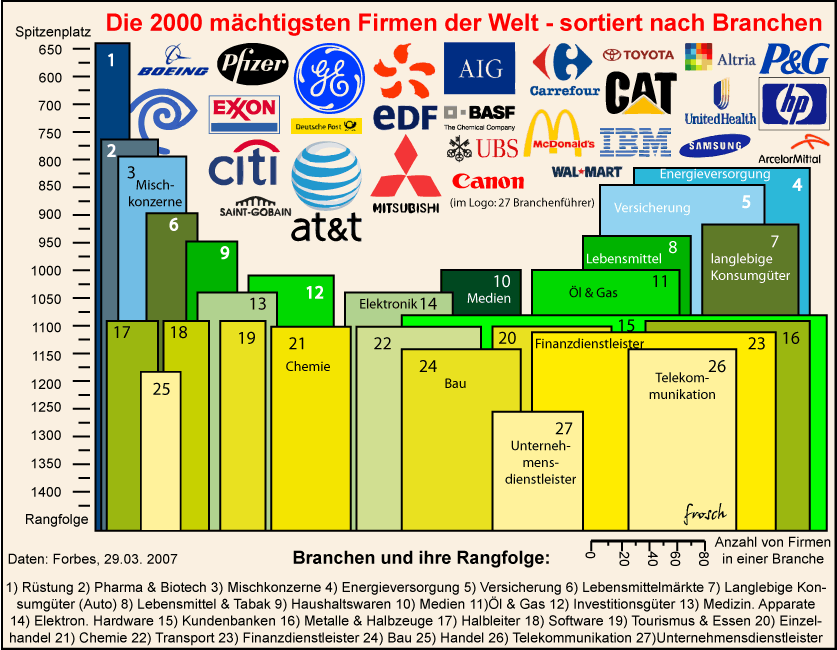 Viel kann man diesem Größenvergleich einzelner Firmen nicht entnehmen. Autofirmen konkurrieren nicht mit Banken. Ölkonzerne befassen sich nur am Rande mit Versicherungsunternehmen. Kapitalistische Konkurrenz konzentriert sich auf gesonderte Märkte und auf Branchen. Deshalb werden in der folgenden Grafik nicht Rang und Größe von Einzelfirmen, sondern Rang und Größe der Branchen auf Weltmarktniveau abgebildet. Die Brancheneinteilung wurde unverändert von Forbes übernommen.