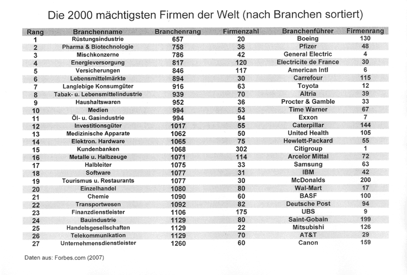 Das Wirtschaftsmagazin Forbes erstellt regelmäßig eine detaillierte Liste der 2000 größten Unternehmen der Welt. Einige Informationen der Forbes-Liste sollen hier vorgestellt und kommentiert werden.