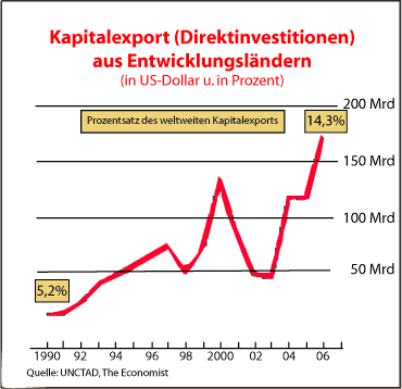 Im letzten Jahr (2006) erreichten die Direktinvestitionen aus der Dritten Welt (einschließlich Firmenkäufe und Fusionen) 174 Milliarden US-Dollar, rund 14 Prozent des gesamten Kapitalexports der Welt. Vor knapp 20 Jahren lagen die Kapitalexporte aus der Dritten Welt noch bei gut 5 Prozent.