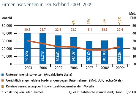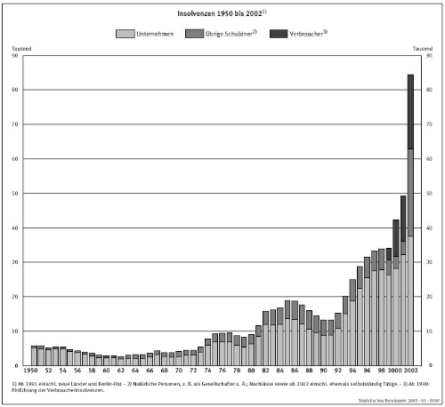 1998: Die Situation bei den Insolvenzen in Westeuropa entspannt sich. Für das Jahr 1998 sind 190.100 Insolvenzen in den Staaten Westeuropas zu veranschlagen. Mit diesem Rückgang um 4,3 % setzt sich die positive Entwicklung fort, die bereits 1997 ... einsetzte.... Es ist vor allem die weiterhin hohe Zahl von Insolvenzen in den neuen Bundesländern, die dafür sorgt, dass Deutschland unter dem Strich 1998 noch einen Zuwachs von 2,4 % bei den Gesamtinsolvenzen hatte. Lit.dok. 99/2000-2, b-582.