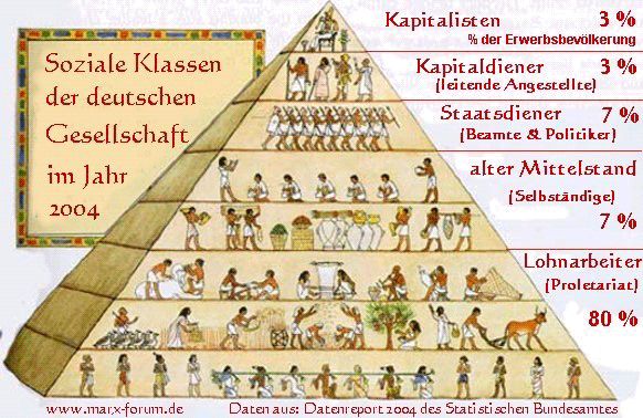 Das möchte ich begründen: Wer auf das Einkommen schaut, betrachtet gleichsam nur die Höhe der Bankkonten, ohne zu fragen, von wo Geld auf die Konten fließt. Der ungleichen Einkommensverteilung liegt eine gesellschaftliche Arbeitsteilung zugrunde, bei der soziale Gruppen oder Klassen unterschiedliche Funktionen erfüllen. Mein Bild der sozialen Gliederung zeigt die folgende Pyramide: