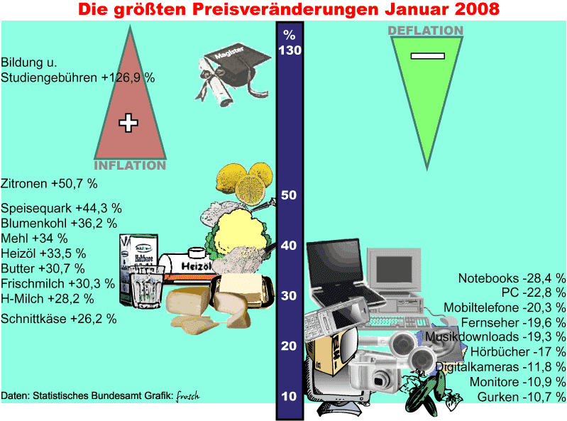 Wegen Einführung der Studiengebühren stiegen im Januar 2008 die Ausgaben für Bildung im Vergleich zum Vorjahresmonat um 126,9 Prozent. Zitronen wurden im gleichen Zeitraum um die Hälfte teurer, Heizöl um ein Drittel, Milch und Milchprodukte um fast 30 Prozent. Trotzdem errechnete das Statistische Bundesamt für den Januar eine Teuerung von nur 2,8 Prozent.