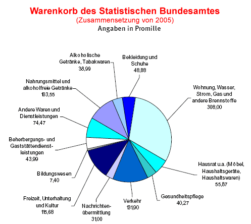 Das Statistische Bundesamt kennt aber weder Reich noch Arm, sondern nur einen "deutschen Normalbürger", dessen Konsum von rund 700 Waren teils aus den Angaben des Einzelhandels, teils aus den monatlichen Aufzeichnungen von freiwilligen Helfern des Statistischen Bundesamtes gewichtet und ausgewertet wird. Im Ergebnis sieht der Verbrauch dieses deutschen Normalbürgers wie folgt aus: