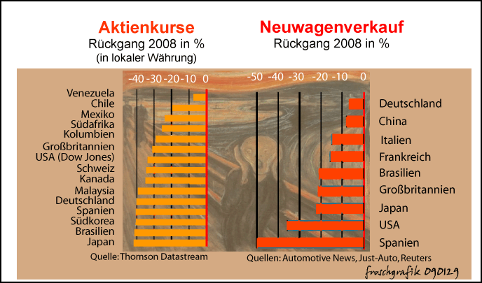Die deutschen Aktienkurse (Vergleich der Dezemberzahlen 2008 mit den Dezemberdaten 2007) fielen zwar im Jahr 2008 um rund 40 Prozent. Aber der Rückgang der Verkaufszahlen von Neuwagen fällt im internationalen Vergleich noch bescheiden aus. Da mag der eine oder andere denken, diese Krise würde um Deutschland einen Bogen machen. Da aber Deutschland hinter China die Exportnation Nummer Zwei ist, wird die Krise der anderen schnell zur Krise der deutschen Exportwirtschaft. Daran kann kein staatliches Konjunkturprogramm etwas ändern. Siehe dazu: Die Ausland AG