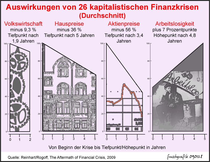 1) Eine kapitalistische Volkswirtschaft, die von einer schweren Finanzkrise betroffen ist, erleidet durchschnittlich einen Rückgang der Wirtschaftsleistung (BSP) um gut 9 Prozent. Davon haben wir bisher wenig gesehen. Die US-Wirtschaft schrumpfte im letzten Quartal 2008 (aufs Jahr hochgerechnet) um knapp 4 Prozent. Das letzte Rekordminus der USA war das erste Quartal 1958 mit 10,4 Prozent minus. Die japanische Industrieproduktion ist Ende 2008 um 9,6 Prozent eingebrochen.