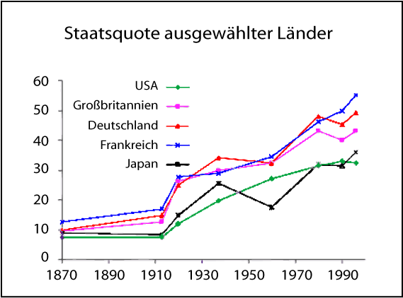 Neben den Folgen des Zweiten Weltkrieges und der Abkehr von wirtschaftlichem Isolationismus hat sicher auch die wachsende Staatsquote in allen wichtigen kapitalistischen Ländern zur Dämpfung von krisenhaften Wachstumsausschlägen nach oben und unten beigetragen. <a href="http://de.wikipedia.org/wiki/Staatsquote"> Staatsquote </a> nennt man den Anteil einer Volkswirtschaft, der vom Staat zwar nicht erwirtschaftet, aber verwaltet und verteilt wird.
